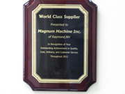 In recognition of your outstanding performance as a supplier of machined and turned parts, your outstanding achievement in quality, cost, and customer service, Magnum Machine has been awarded Supplier of the Year by a large East Coast customer.